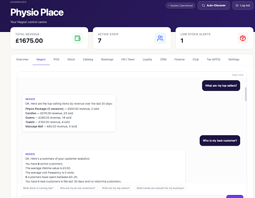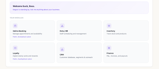 Tell Negozi AI what business you run and it will create a dashboard of tools to run your business e.g. "Hi Negozi... I run a coffee shop selling artisan coffee and fresh bakes, I have 2 staff and myself running it, its called Coffee Zone..."